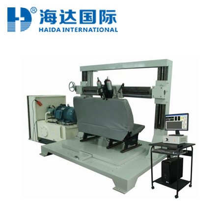 整机采用四方体空间结构,横梁可以上下升降、轴向旋转(可换向对座椅和靠背测试)、双向油缸于横梁上可以左右移动(可针对单椅、双排 或三排座椅部位测试),试验空间可任意调整,轮辐式传感器位于油缸顶杆与顶块中间,与顶杆采用无缝联接,保证试验过程波形的不失真。 该试验机又叫动静万能试验机,可以做低周疲劳试验,实现任意随机波形、正弦波形、方波、三角波、锯齿波等波形,且按试样的强度不同,频率可调范围为:0.1~10Hz。